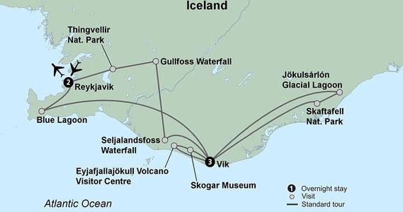 Vik - Lava Exhibition Centre - Blue Lagoon - Reykjavik. Drive along the south shore towards the Reykjanes Peninsula, stopping at the Lava Exhibition Centre to learn about Iceland’s historic eruptions and current lava flows that make the island