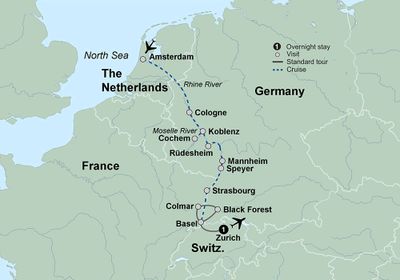 Amsterdam, Netherlands - Board Ship - Tour Begins. Your tour opens in Amsterdam where you will board your cruise ship for a 7-night cruise along the Rhine River. Your ship offers an array of amenities including outside staterooms, unlimited wine with every dinner, and daily onboard musical performances. This evening, meet in the lounge for a cocktail reception followed by a "welcome aboard" dinner. (D)